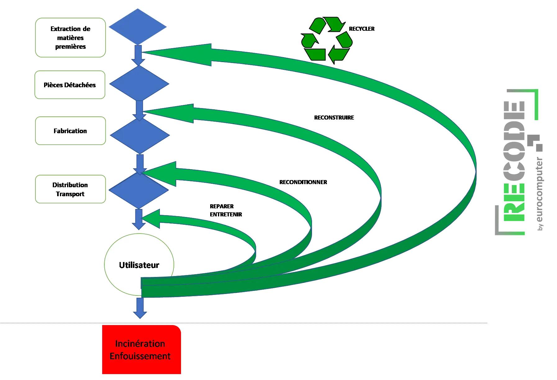 Recode est impliqué dans les phases d’entretien, de reconditionnement et de reconstruction. Notre objectif est de limiter la phase de recyclage et celle ultime qu’est l’incinération ou l’enfouissement.